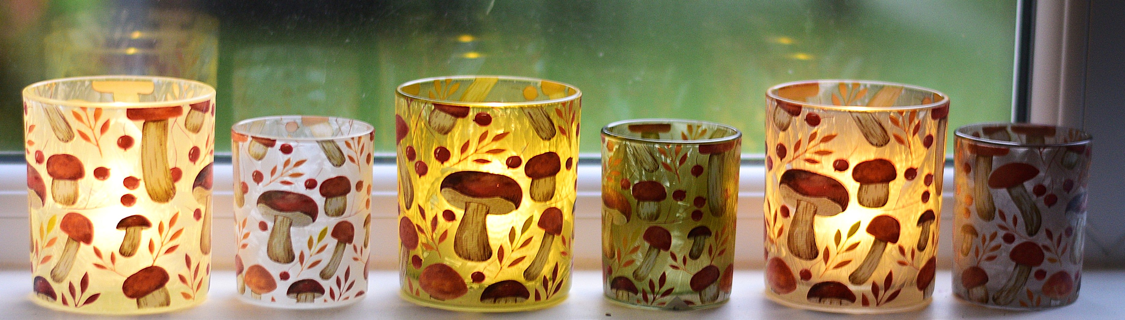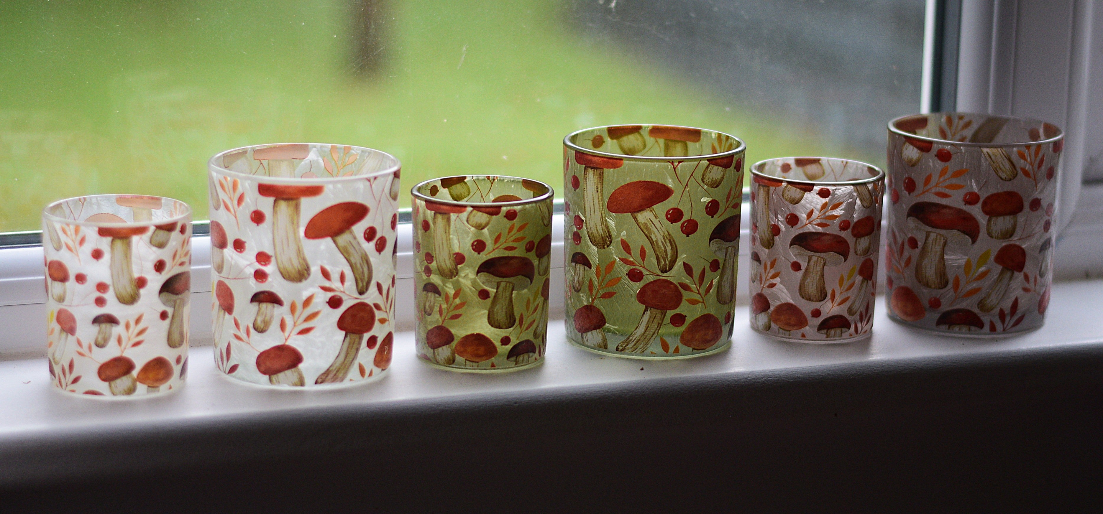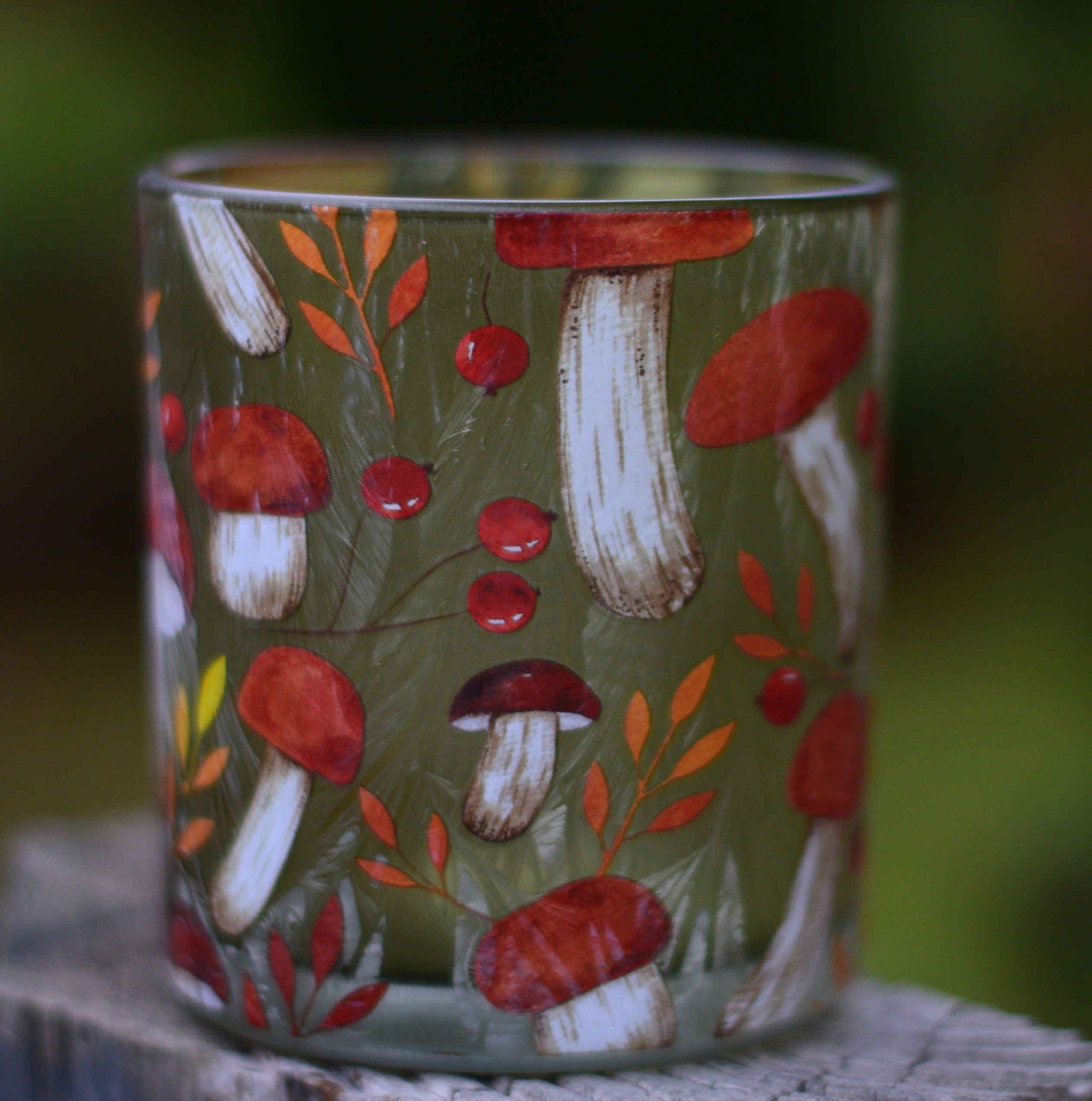 Like a misty morning in a foggy forest, where mushrooms peek through fallen leaves and berries glisten in the cool air — these frosted glass candle holders capture that magical autumn moment. The delicate woodland motif of mushrooms, leaves, and berries shimmers softly in tones of green, white, and brown, coming to life when a candle glows inside.