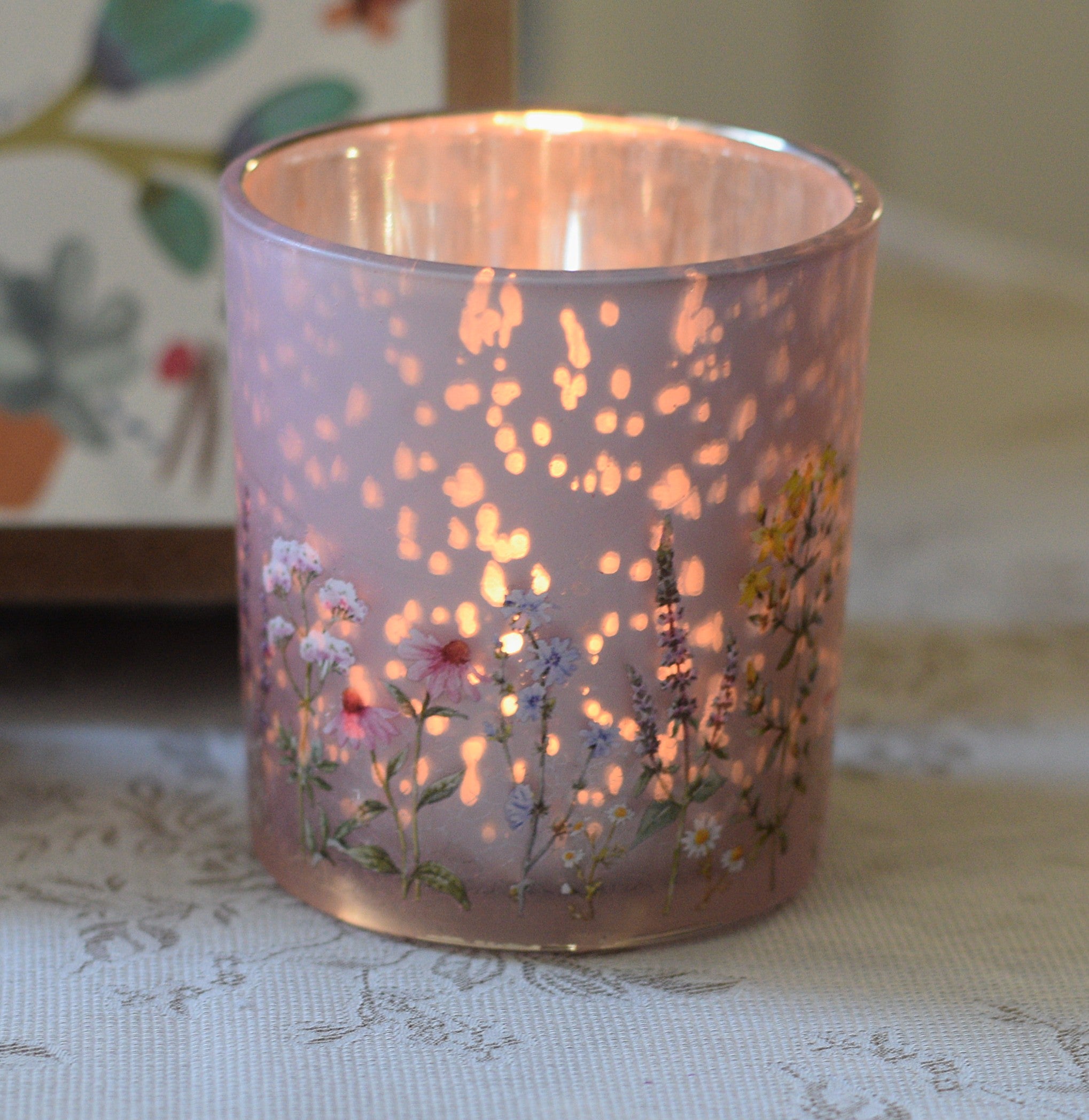 Its gentle pink hue, reminiscent of wildflowers at dawn, adds a soft, romantic touch. The slightly frosted matte finish diffuses light beautifully, giving it a dreamy, understated elegance when illuminated. The embossed floral patterns on the exterior evoke a tranquil meadow, adding texture and visual interest to the design.