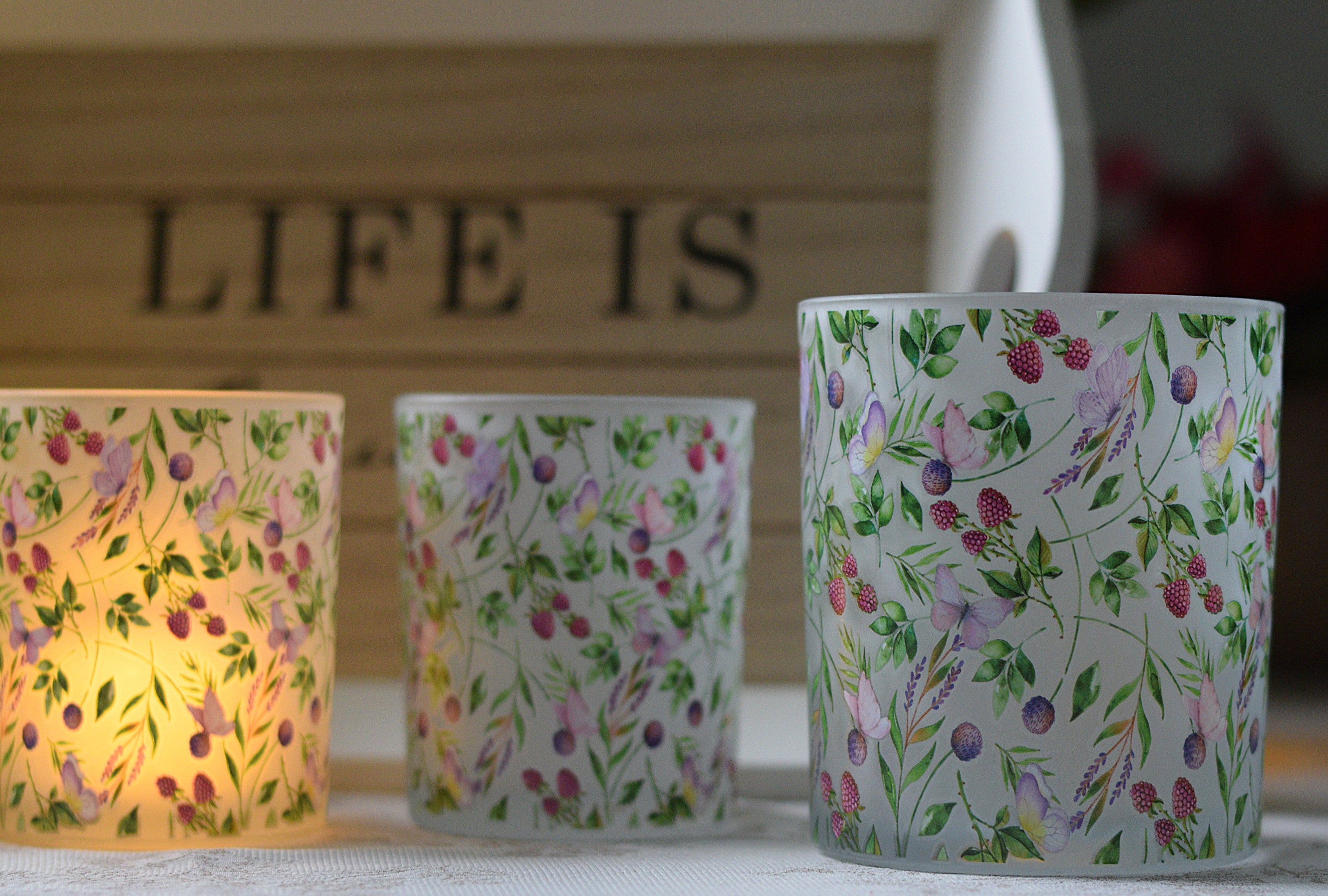 A beautifully detailed frosted glass candle holder wrapped in a delicate meadow-inspired print. Soft green foliage weaves gently around tiny pink blossoms and berry clusters, creating a light, romantic pattern that feels fresh and uplifting.