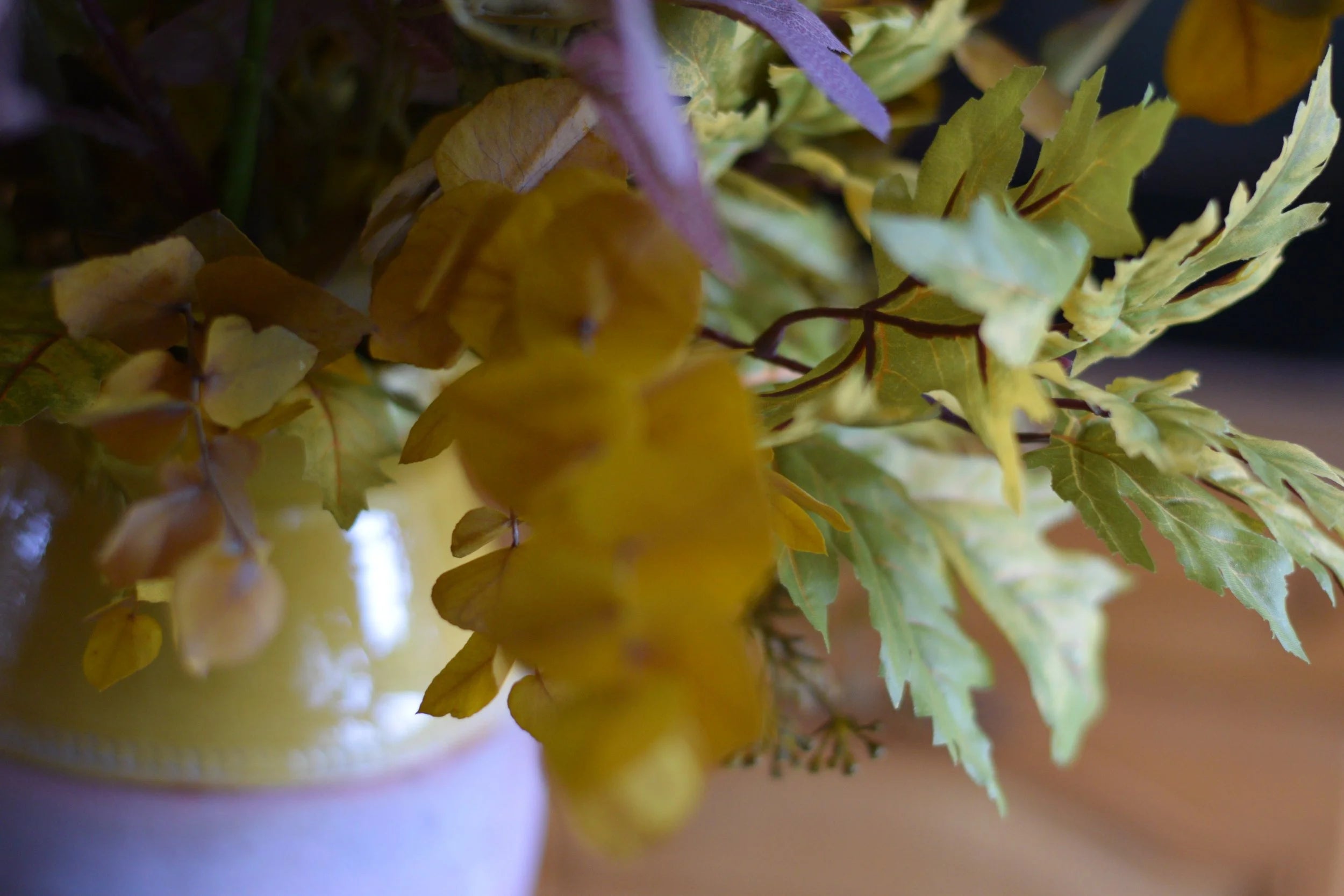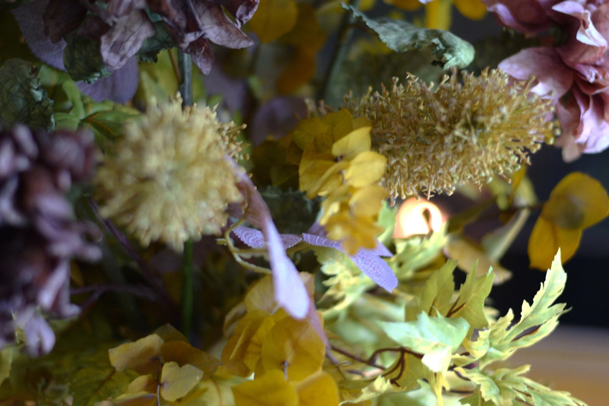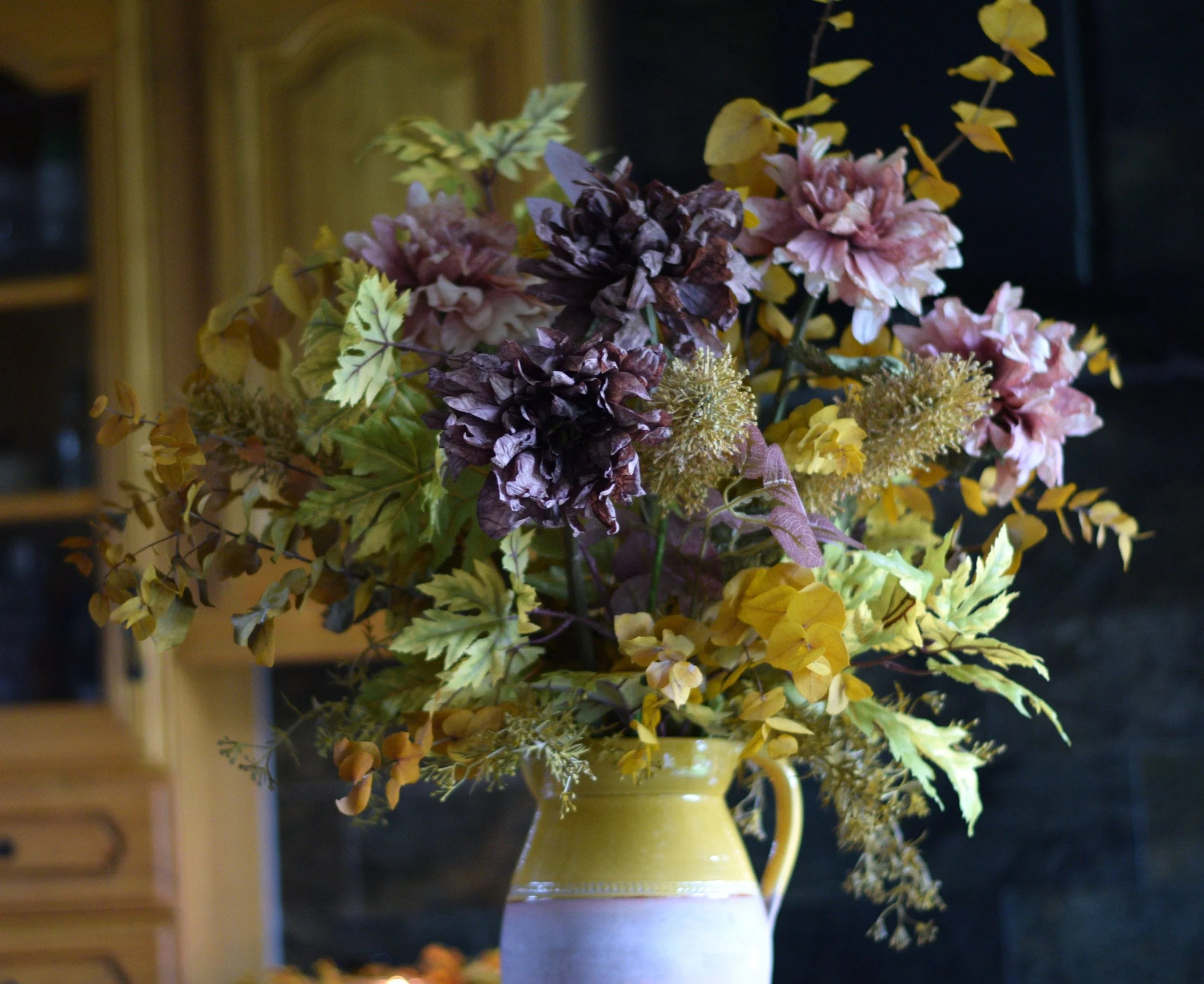 This arrangement features a mix of 14 stunning stems: dahlias, yellow maple stems, meadow grass, foxtail lily spiky stems, rose foliage,and preserved yellow eucalyptus. The stems stand approximately 65-70 cm in height, with a similar width.
