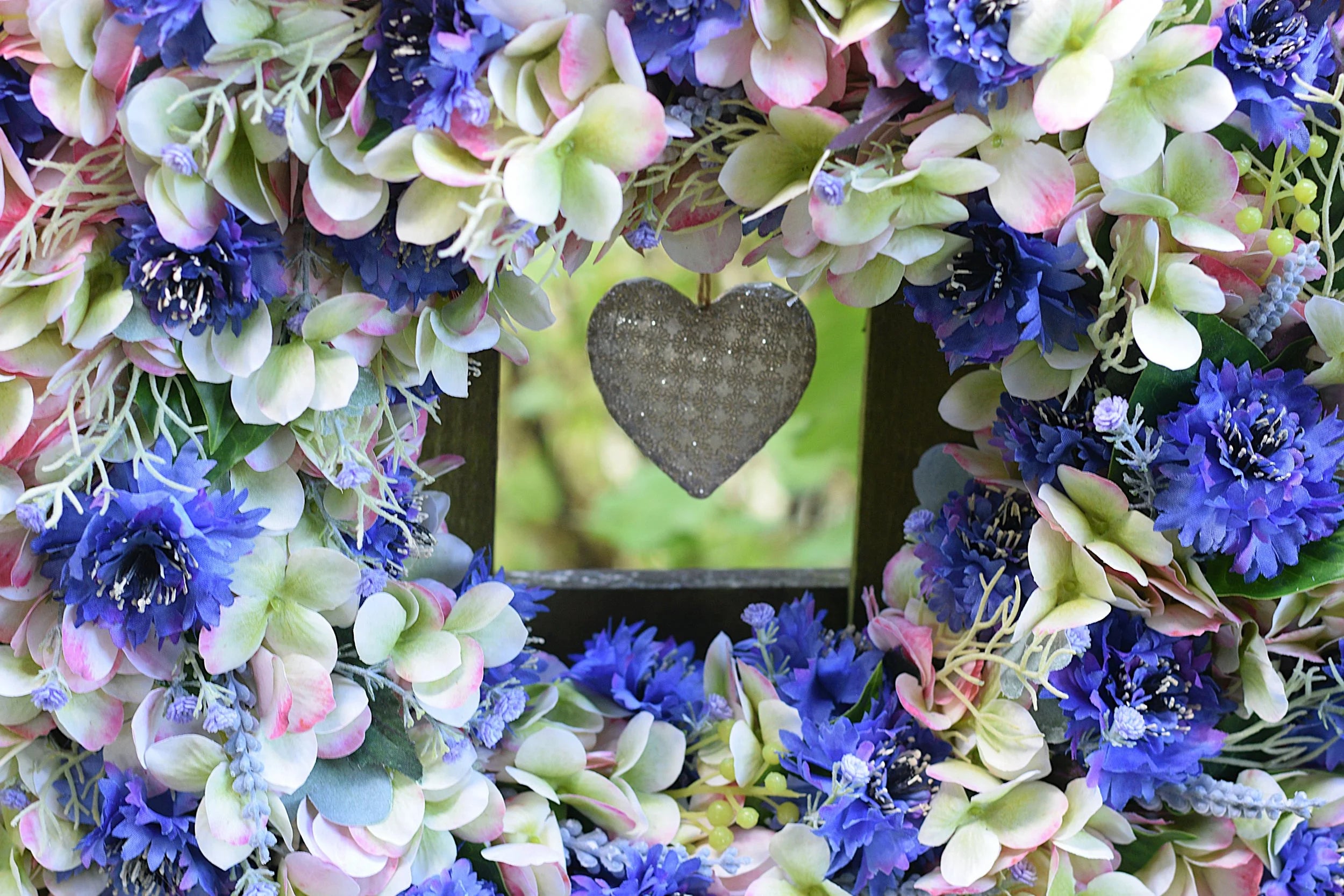 Two-toned faux hydrangea and cornflower wreath