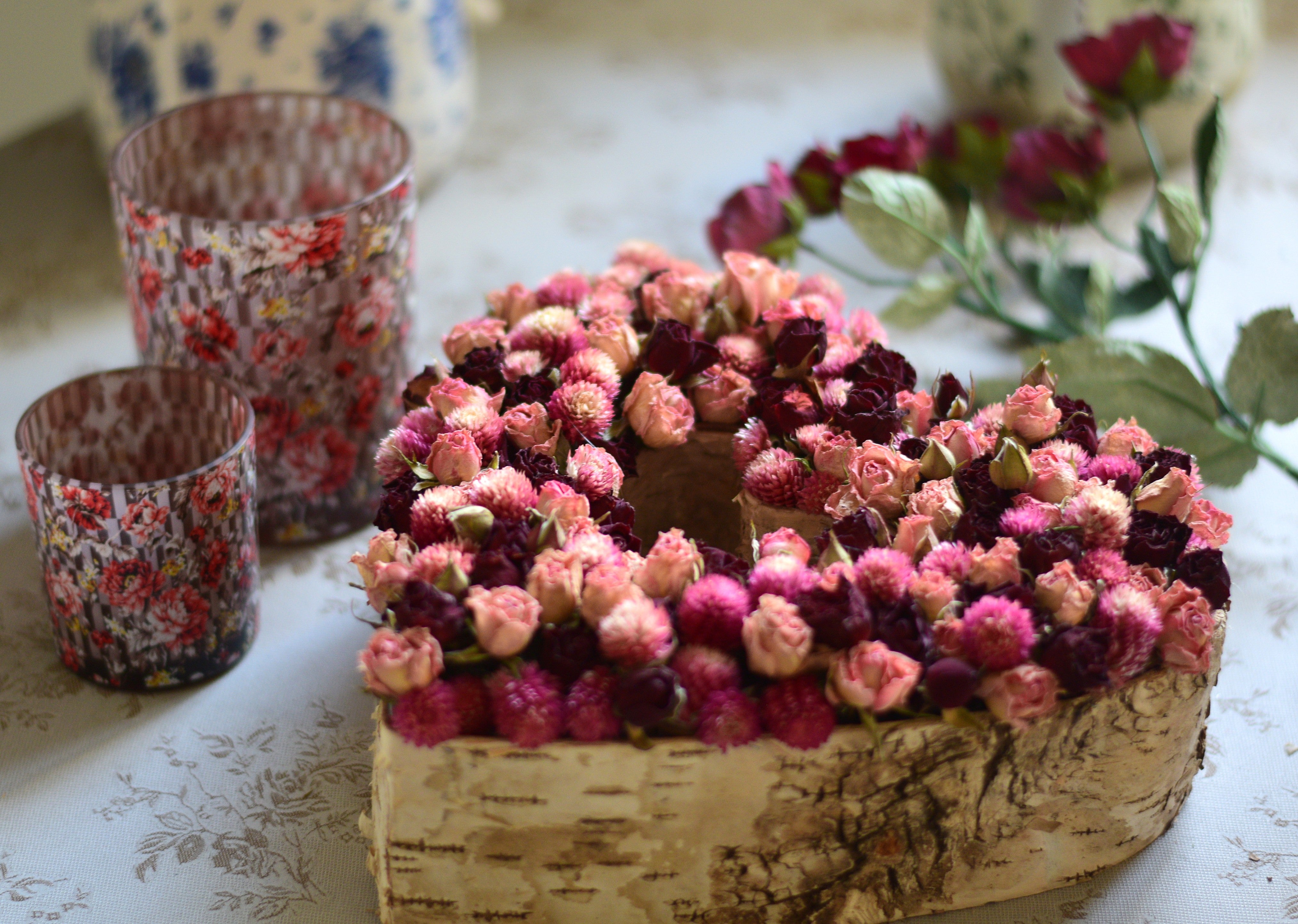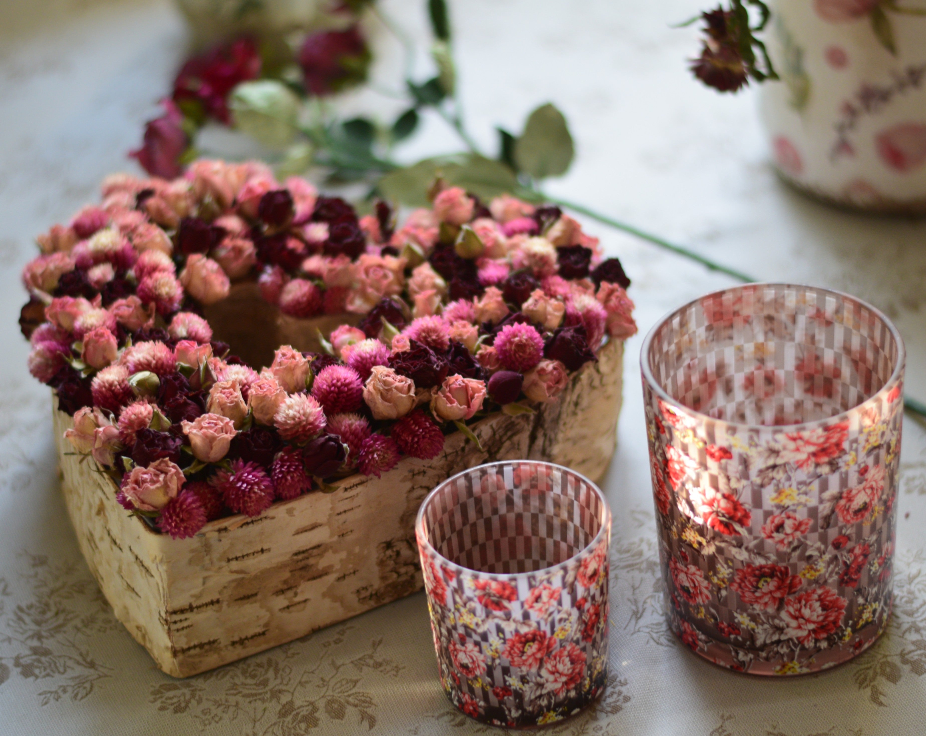 A rustic heart-shaped arrangement crafted on a natural birch base and filled with burgundy and soft blush-pink dried roses, accented with delicate red clover. Rich in colour and texture, this piece brings warmth, charm, and a gentle romantic feel to any space.