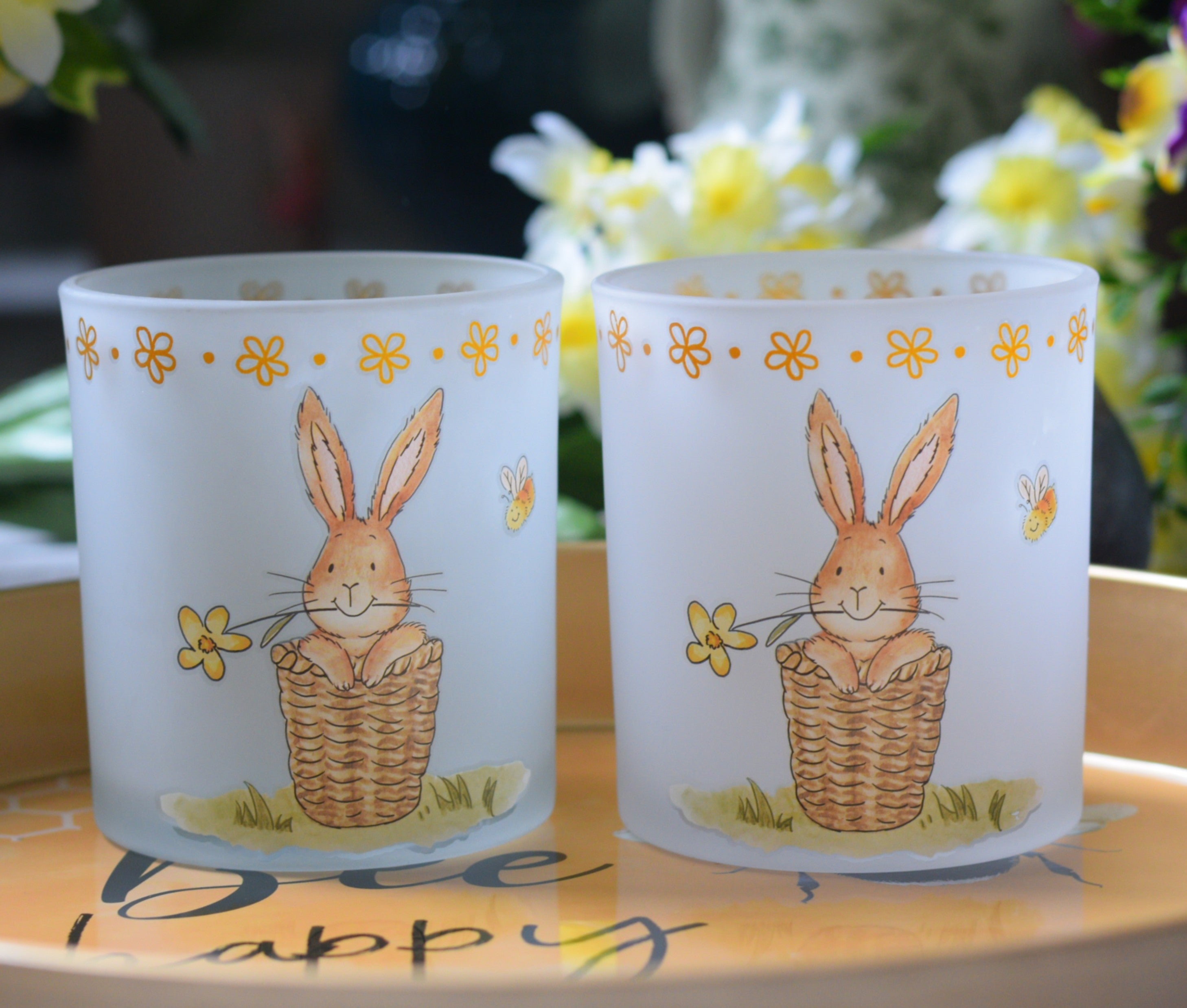 A sweet and cheerful frosted glass candle holder featuring two charming rabbit illustrations on each piece. Each bunny peeks playfully from a woven basket, surrounded by soft meadow details — a little yellow flower and a tiny buzzing bee add extra springtime charm.