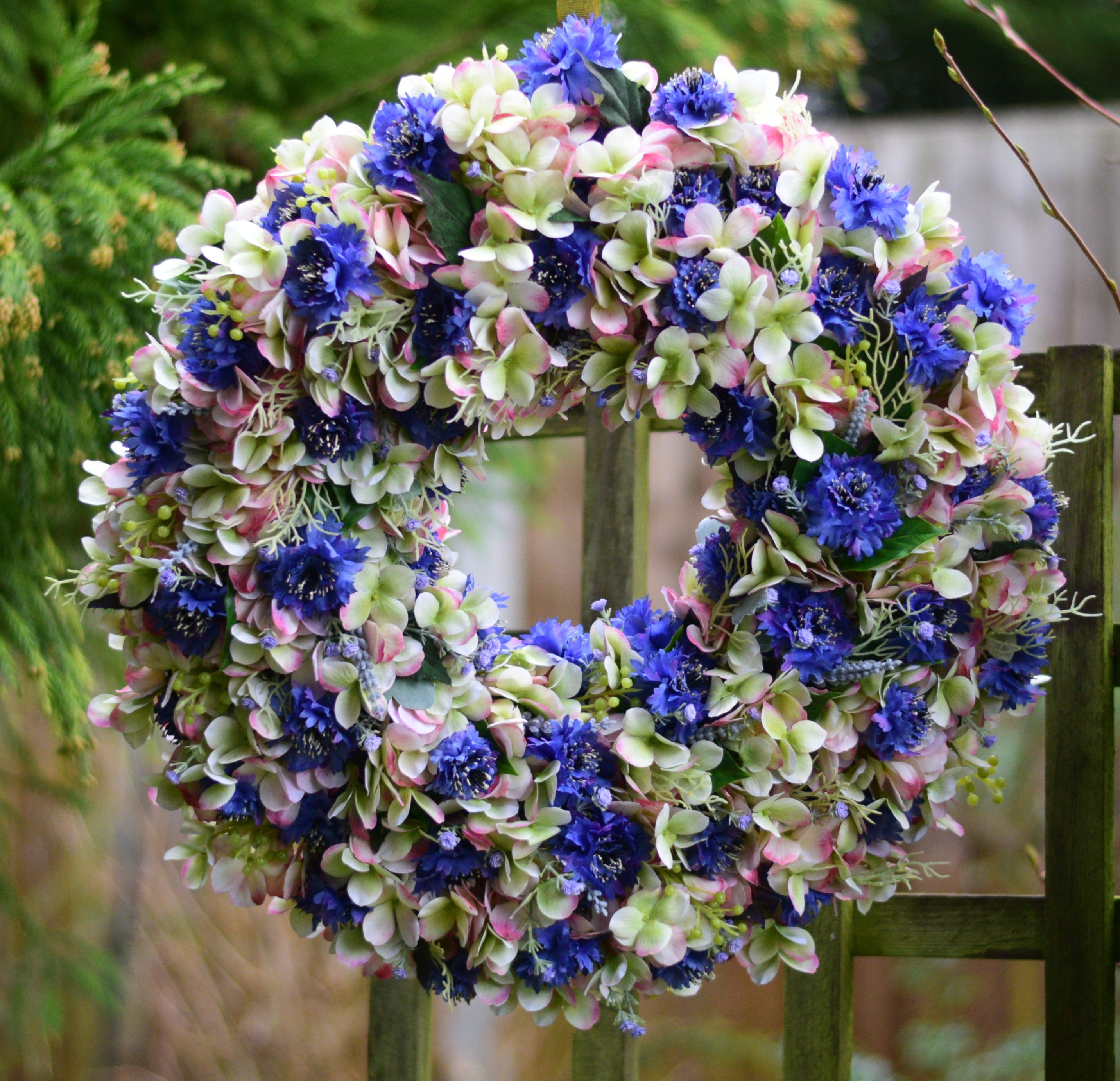 Absolutely stunning, this two-toned faux hydrangea and cornflower wreath is a true one-of-a-kind creation, featuring a charming silvery heart nestled at its centre. A subtle blend of gently hidden hydrangea and begonia leaves adds depth, while soft lilac gypsophila and a hint of lavender bring a delicate, romantic touch. Rich in texture and carefully handcrafted, this wreath is full of character and quiet seasonal beauty.