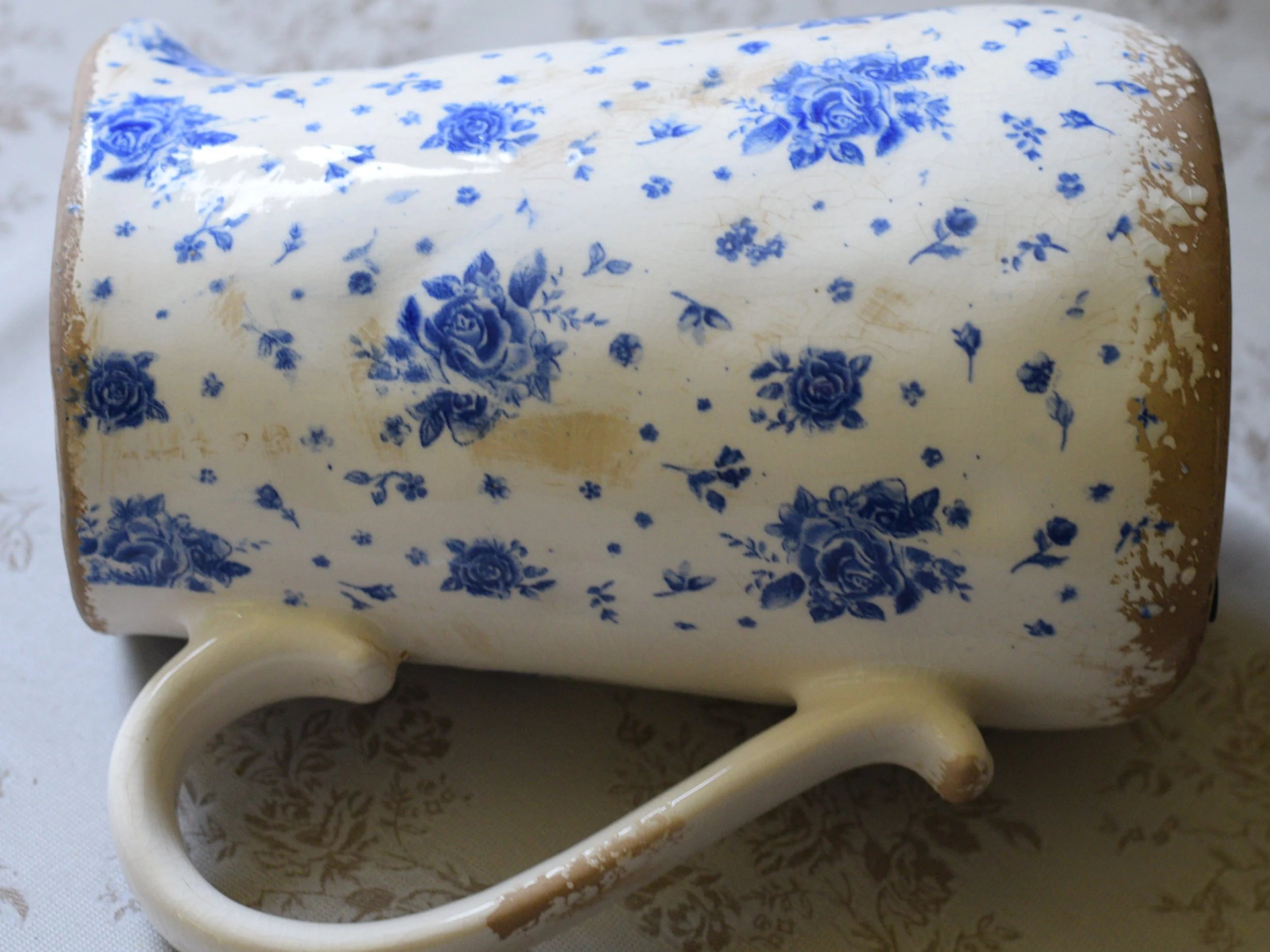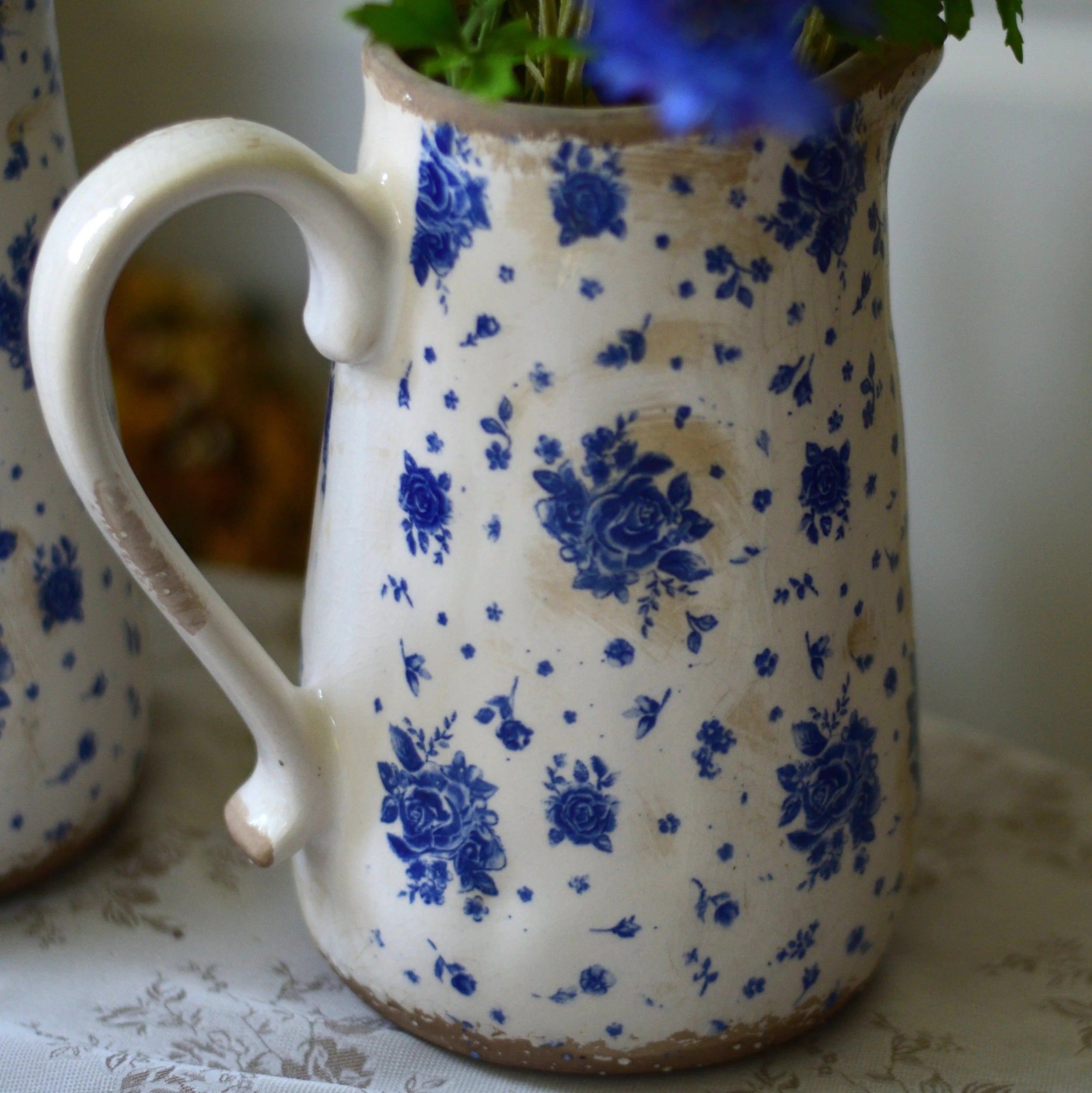 This gorgeous vintage-style pitcher vase features an elegant arrangement of soft blue medium-sized roses, delicately paired with smaller flowers in the same calming hue. Set against a softly distressed white base, the floral design stands out beautifully, offering a gentle yet striking contrast that evokes timeless charm.