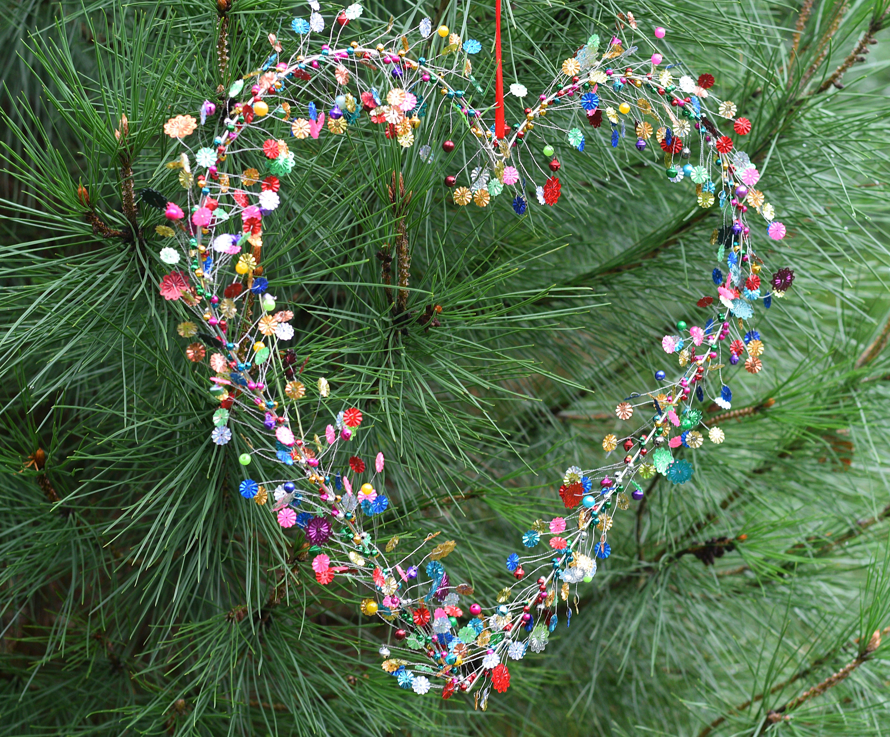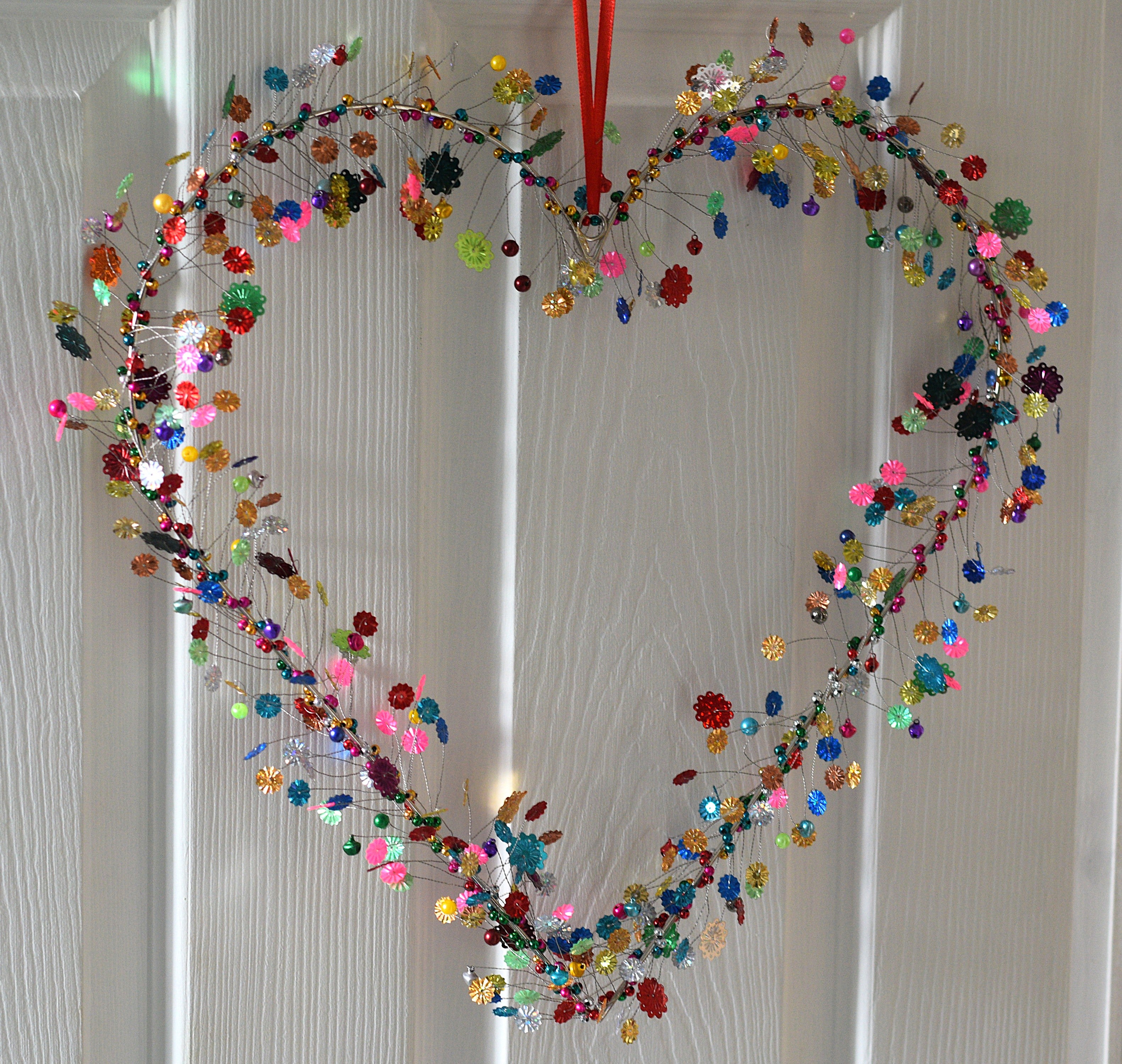 A vibrant celebration of colour and joy, this heart-shaped wreath feels like a little burst of happiness for your wall. Crafted on a fine yet sturdy wire frame, it’s delicately wrapped with shimmering threads and scattered with tiny metallic blossoms, playful beads and sparkling accents in an uplifting mix of pinks, blues, greens, golds and sunshine brights.