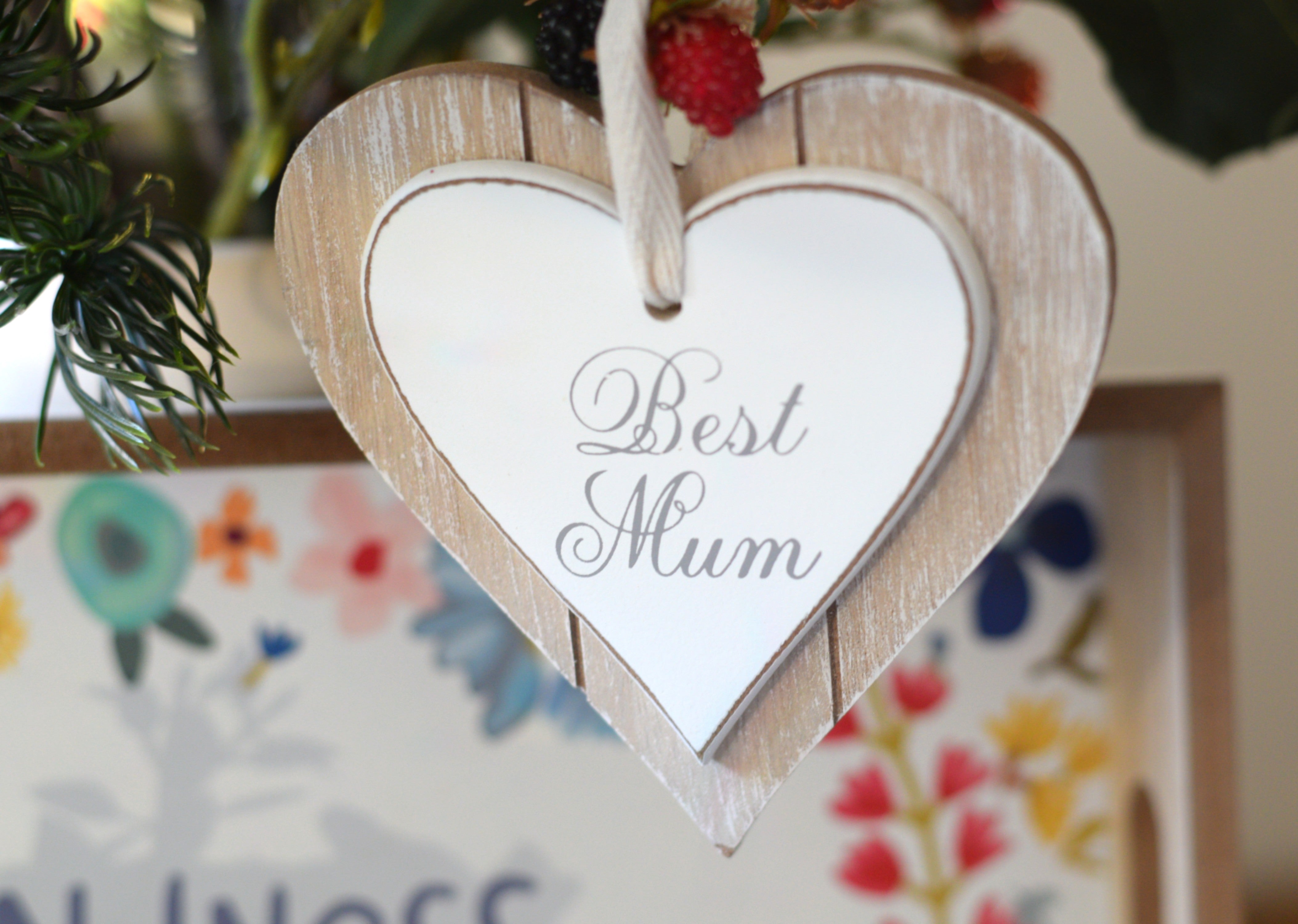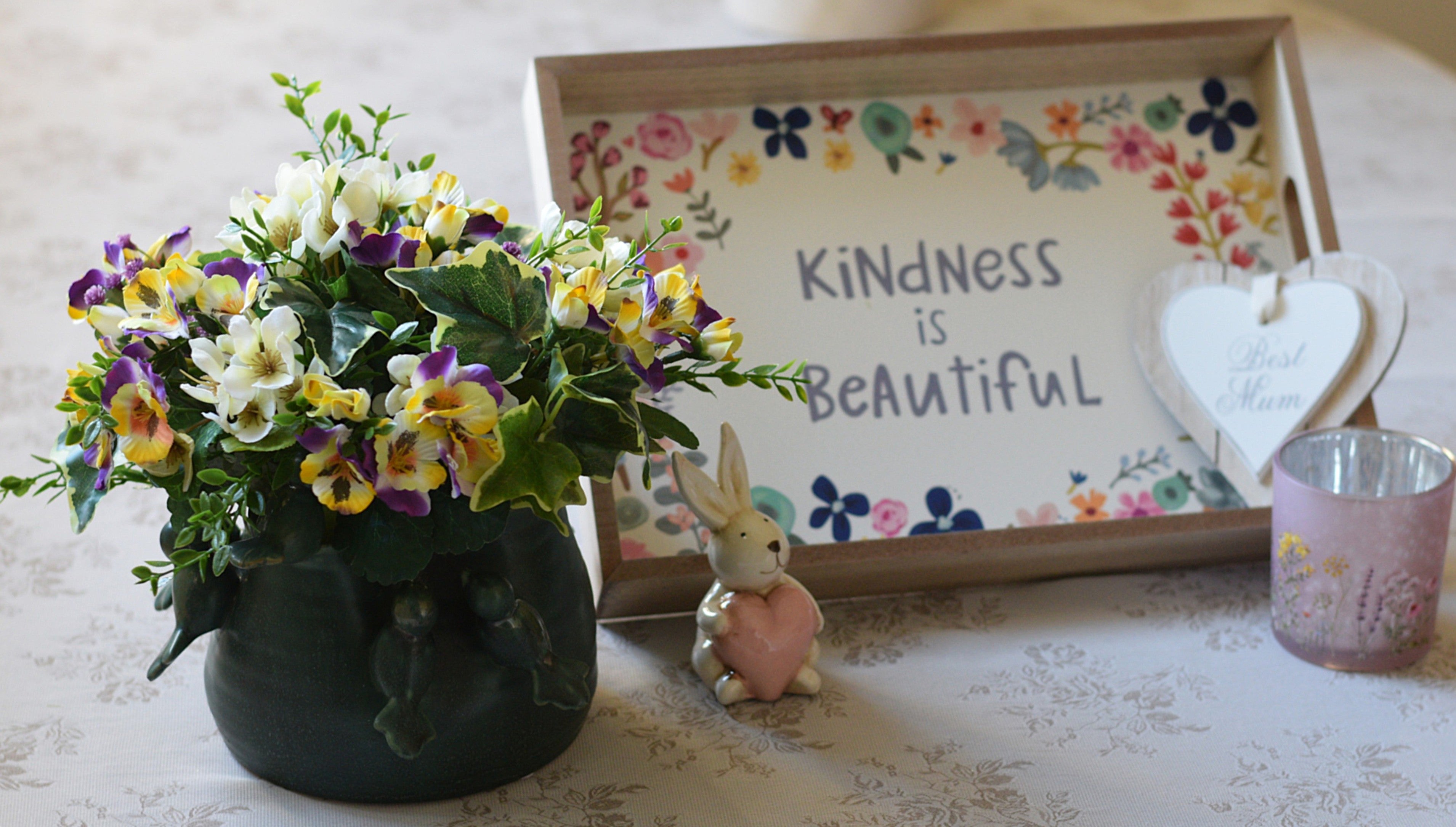 A charming dark vintage-style green ceramic pot is filled with a lush arrangement of faux pansy-style flowers, bringing soft colour and gentle garden charm. A small ceramic bunny holding a heart adds a heartfelt message without any words. A wooden tray painted with delicate florals carries the words “Kindness is Beautiful”, setting a warm and meaningful tone for the whole display. A hanging heart plaque with the message “Best Mum” adds a personal finishing touch, making it especially perfect for your lovely mum. A soft pink glass candle holder completes the arrangement, adding subtle sparkle and balance.