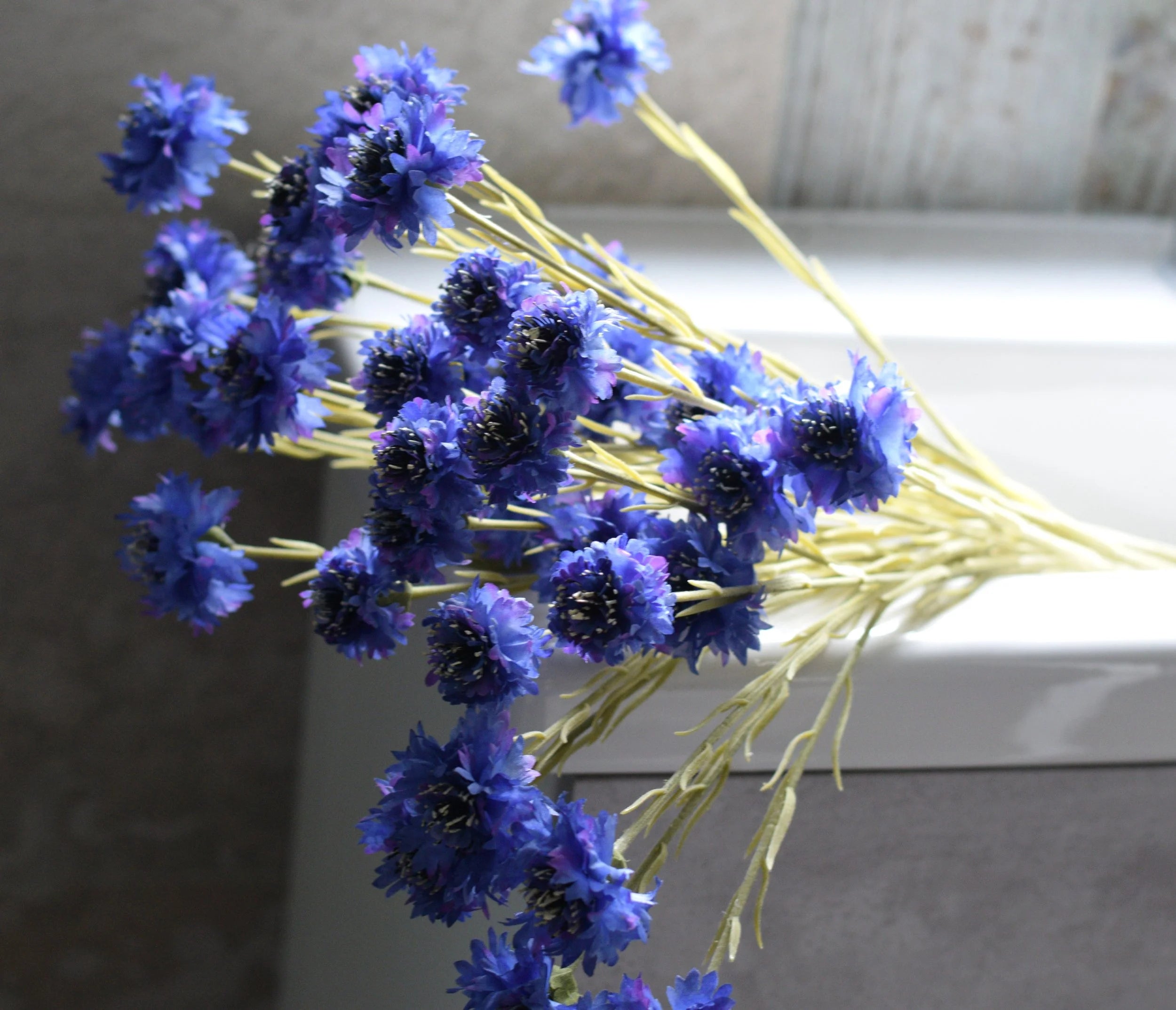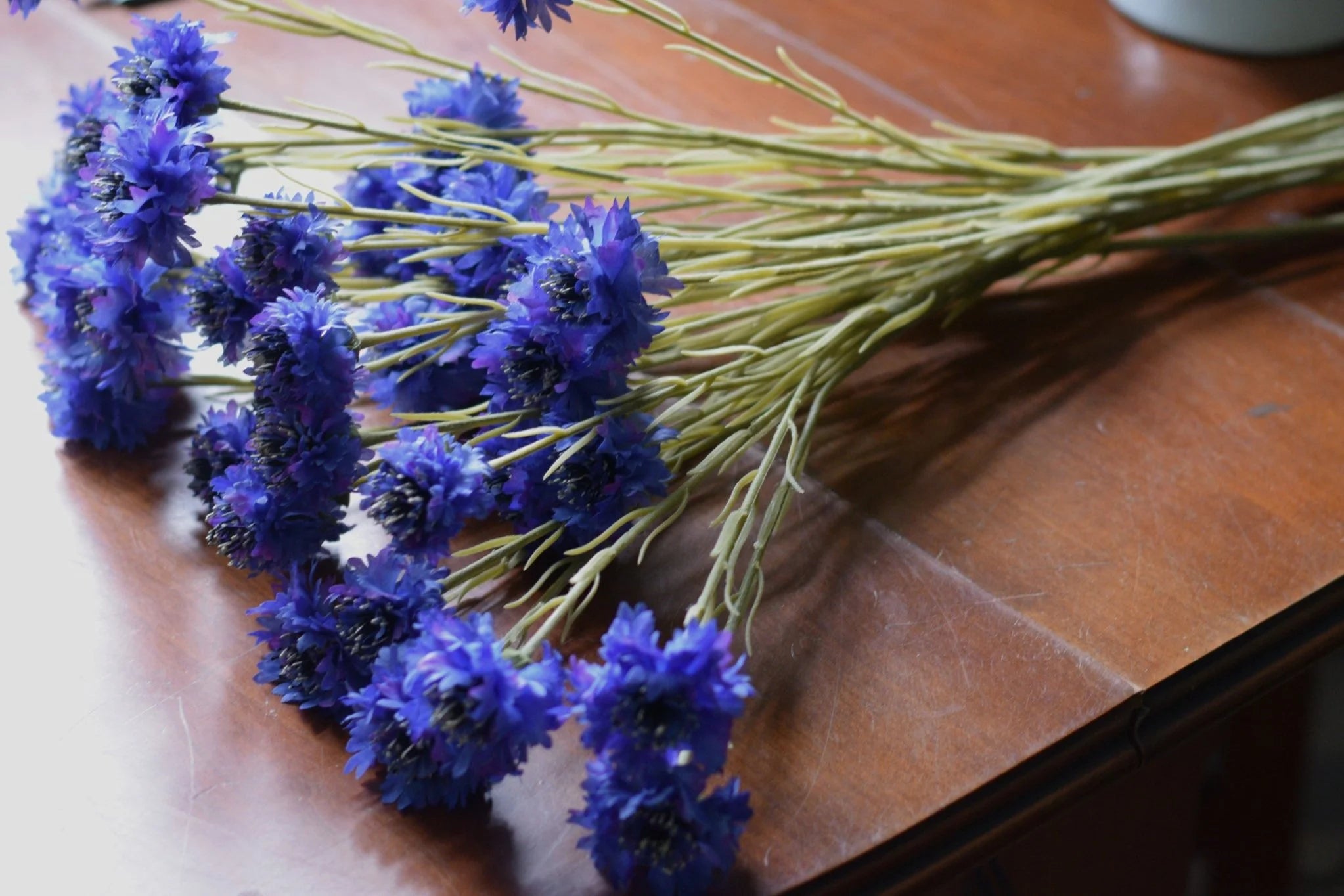 Imagine a golden wheat field with blue cornflowers against a sky horizon. This exquisite delicate bloom flowers from June to August, generally alongside other field flowers, but you can enjoy its lovely blossoms all year.