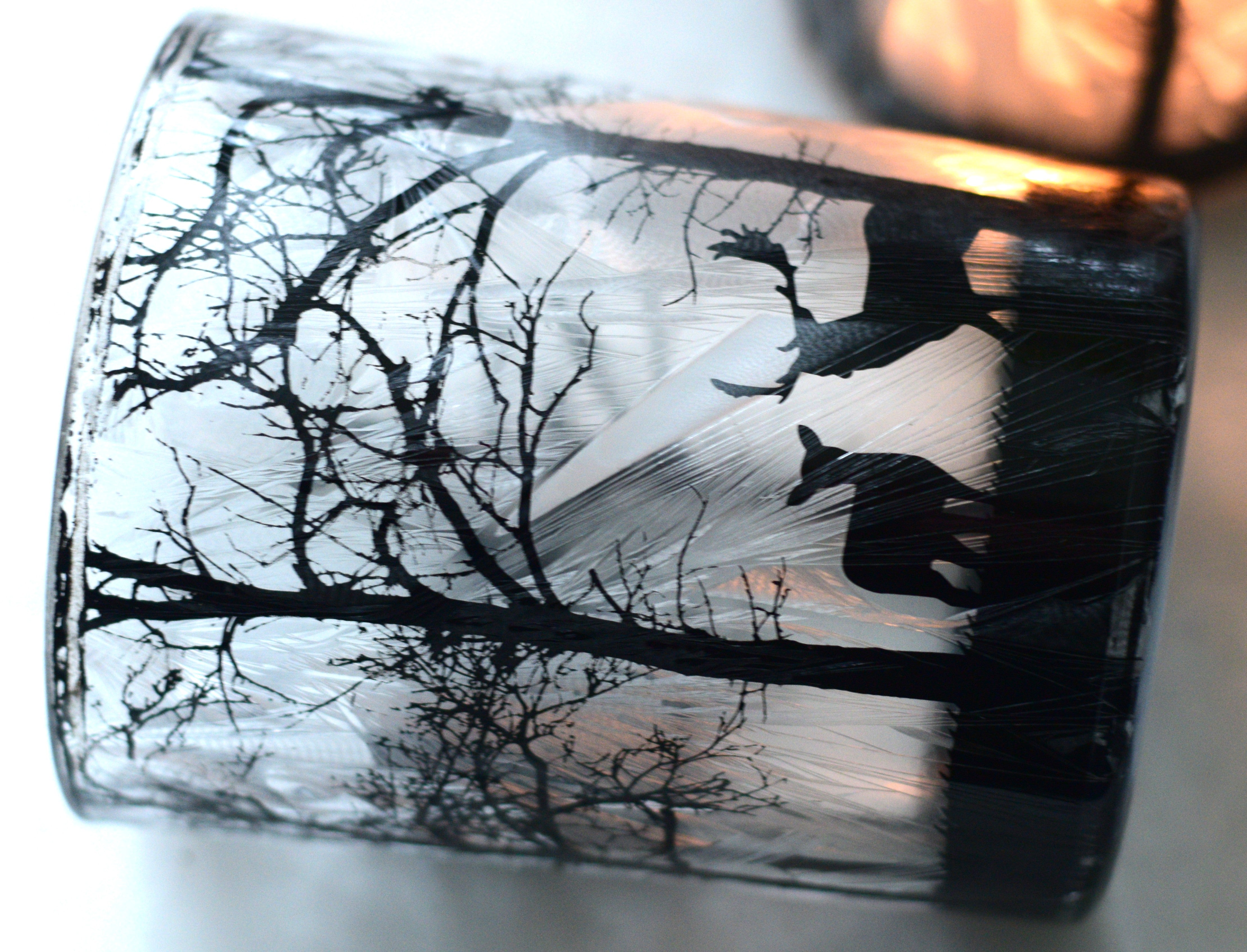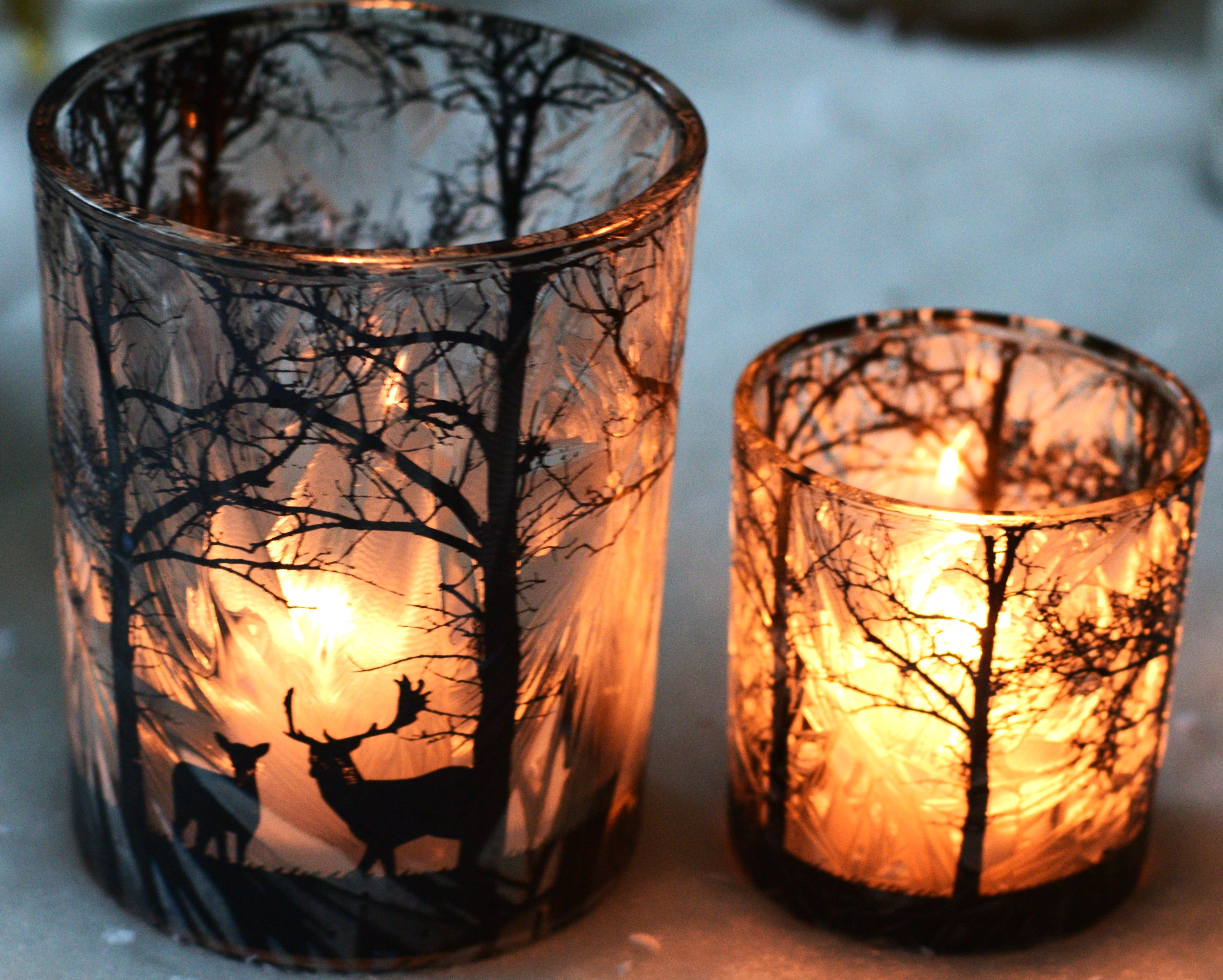 When lit, the frosted glass casts a soft, spectral glow, bringing the stags, deer, and eerie woodland to life as if the scene itself is gently moving through moonlit fog. The flickering light reveals a setting that feels both magical and mysterious — like being lost in a frozen forest on a winter night.