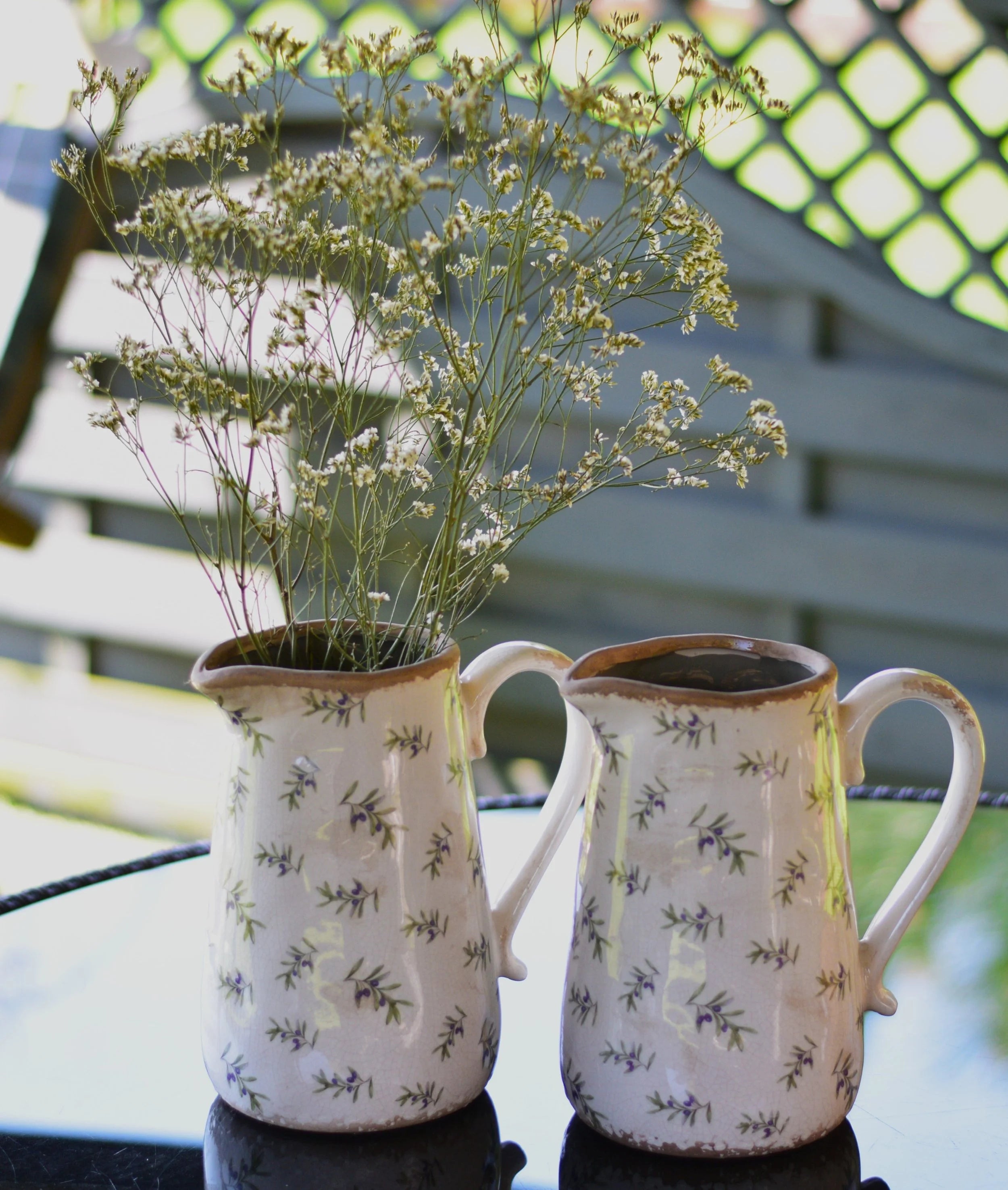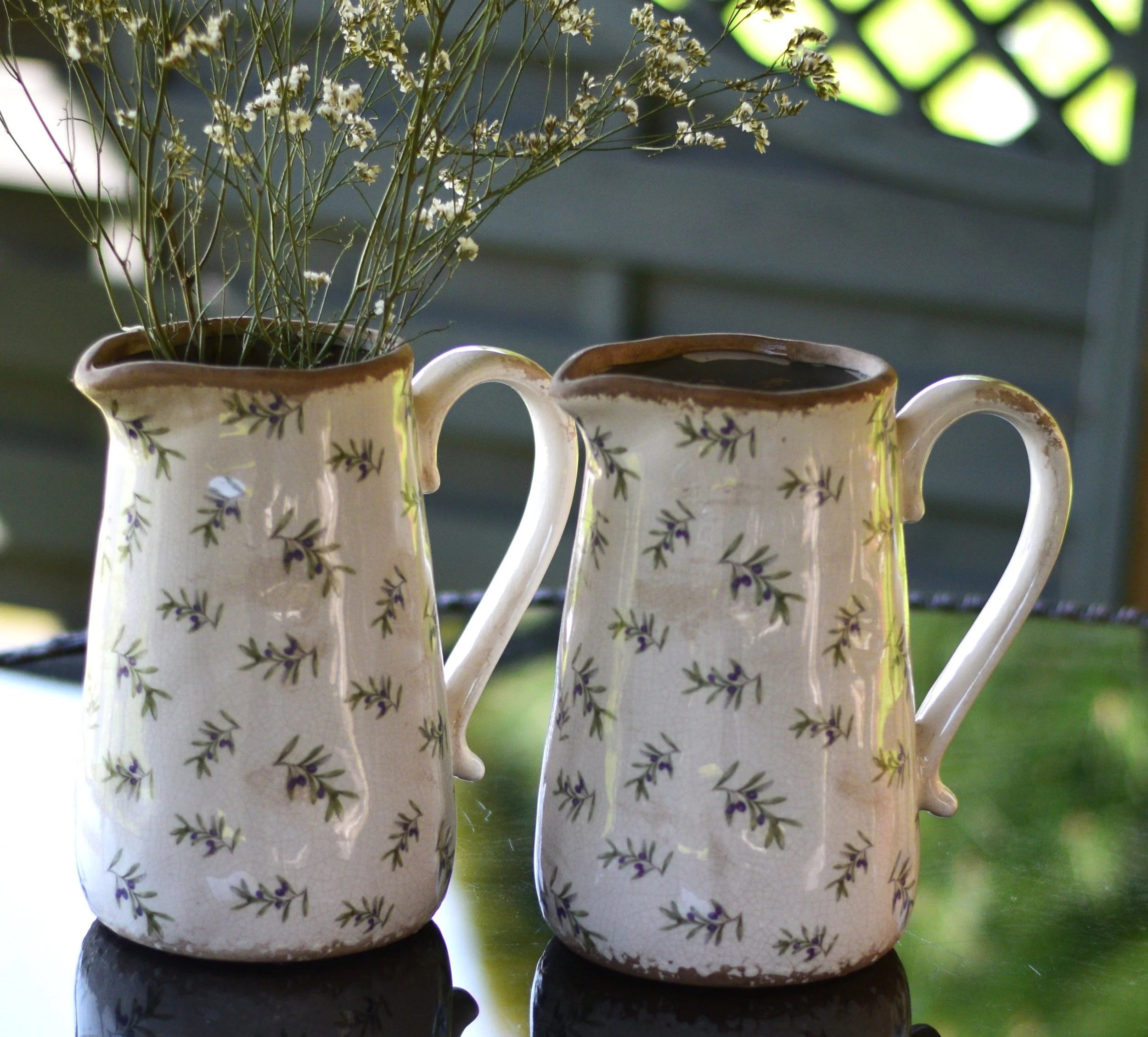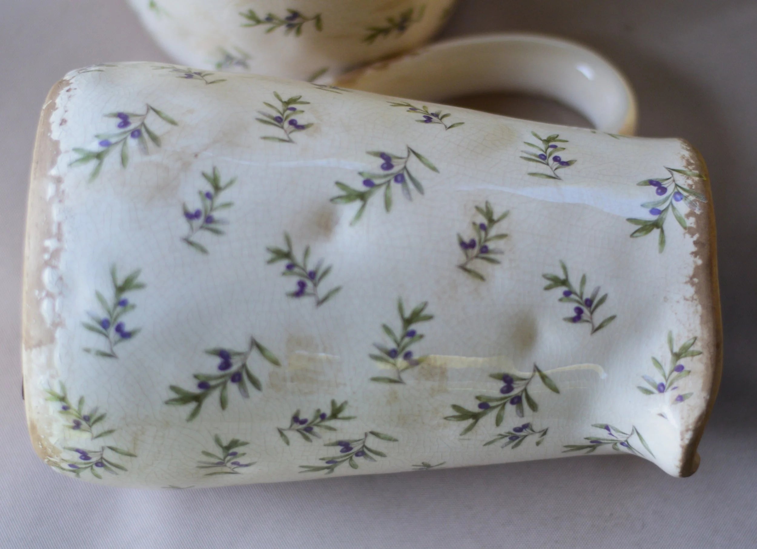 This vintage-style pitcher vase is a beautifully crafted piece that captures rustic charm with timeless appeal. The soft, muted white base—evoking the look of aged parchment—is gently distressed, creating the appearance of a well-loved heirloom. Wrapping around its surface are finely detailed illustrations of slender olive branches, complete with sage-green leaves and tiny, dusky purple olives. These subtle botanical accents lend a natural, Mediterranean-inspired elegance to the design.